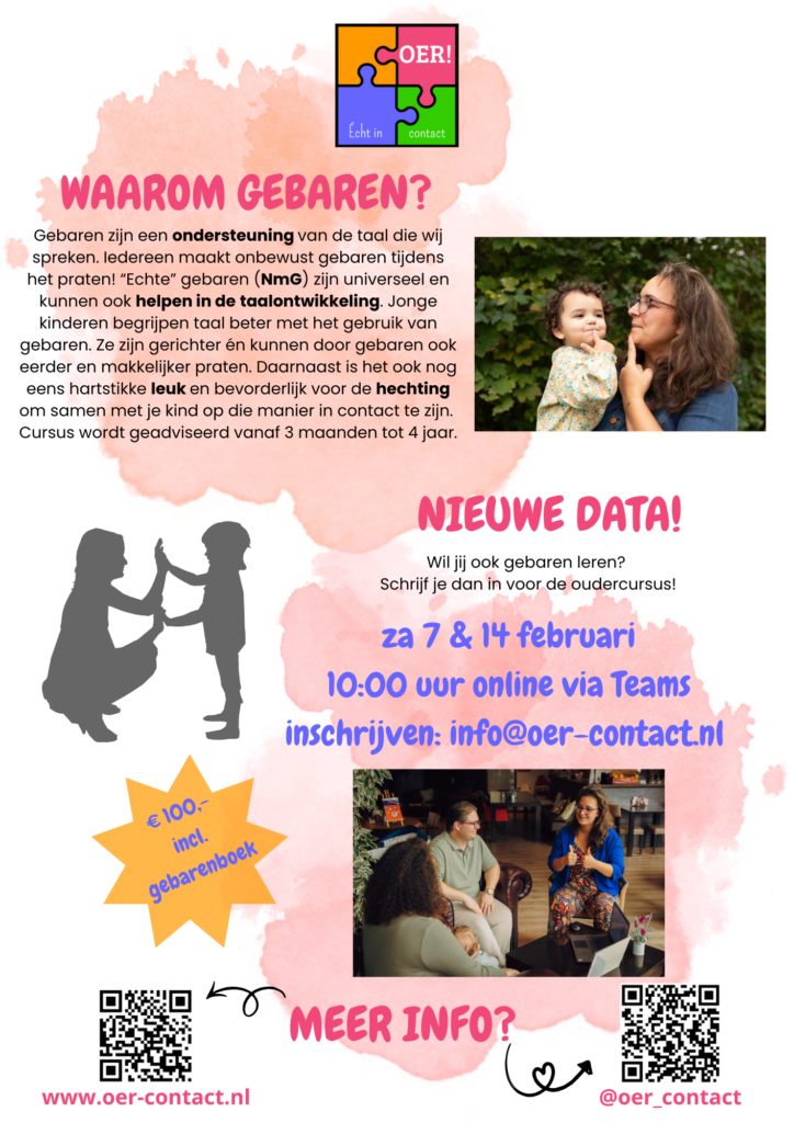 Op 7 februari start er weer een nieuwe oudercursus Baby- en Kindergebaren bij OER!